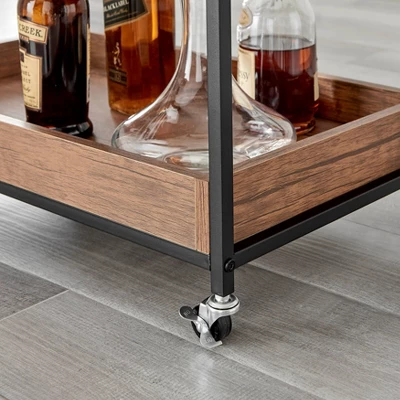 - Combines industrial metal hardware and accents with warm farmhouse walnut wood tone trays to achieve a rustic and charming style for this wine bar cart