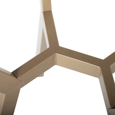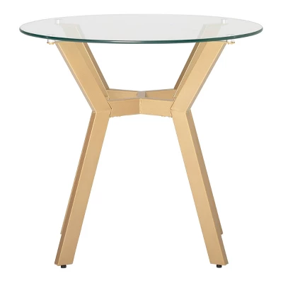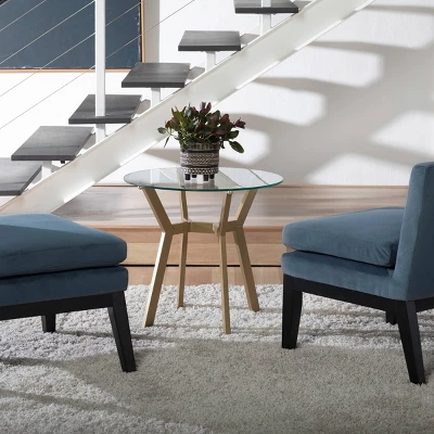 The mid-century modern inspired design of the ArchTech 24” Round, End Table by Studio Designs Home makes it a sleek and elegant addition to your home. The boomerang-shaped legs have a gold, powder-coated finish that resists scratching and corrosion. The thick, clear tempered glass top floats over the angled legs creates an open and airy feel to a small space. The modern, simple lines of this metal and glass side table and handsome finish make it a stylish addition to your living room. It is lightweight and easy to assemble.