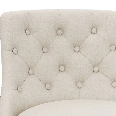 - The round 360 degree swivel seat is upholstered in a cream fabric