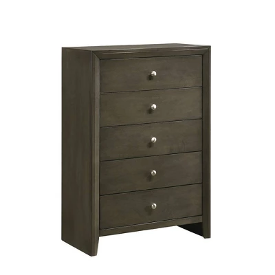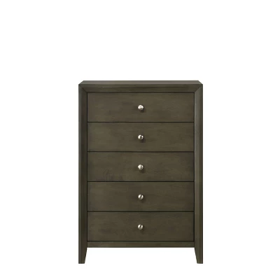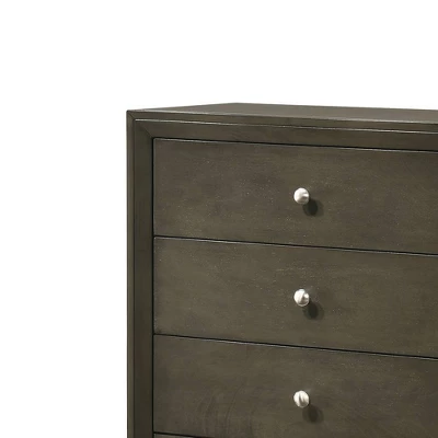 The Ilana contemporary bedroom set is expertly crafted with hand selected woods and veneers in a calming gray finish, featuring a modern slatted headboard design, low profile footboard and wooden tapered legs. With all matching case goods, this bedroom group will sure to refresh your bedroom or guest room. Simple in stature and design, this humble chest offers convenient storage for any bedroom. Five drawers provide room for clothing and blankets, with small round knobs in an antique brass finish for a polished touch. Grounded on tapered feet, this gray chest envelops your bedroom in warm notes and simple storage.
