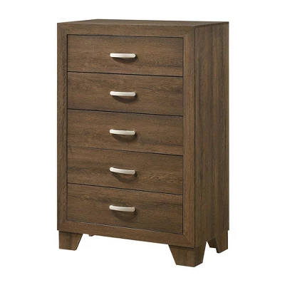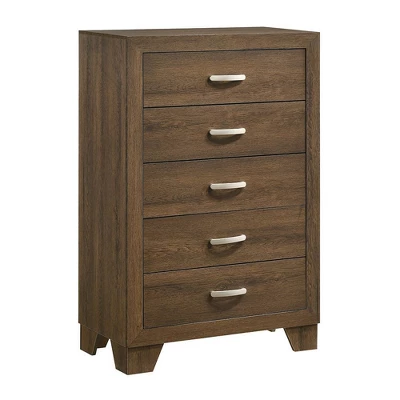 The Miquell Chest provides a commanding presence in any bedroom. This contemporary chest features five storage drawers with metal handles. All expertly crafted with a transitional look that is an ideal addition to any bedroom. This fashionable chest will fuse with the surrounding decor and accent your other bedroom furniture, transforming a room from ordinary into something interesting and sophisticated.