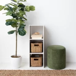 Keep clutter out from underfoot with this three-cube organizer. The natural finish over replicated sugarberry wood grain is warm and inviting, all while keeping your toys, knickknacks and other items stored away. The perfect marriage of style and function, this organizer is an ideal addition to any busy living space. Signature Design by Ashley is a registered trademark of Ashley Furniture Industries, Inc.