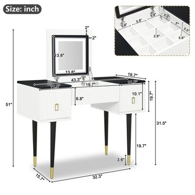 Bring a chic look to your bedroom with this elegant vanity table in contrasting shades of classic minimalism. The vanity table has a square mirror that can be hidden, with LED lights on both sides of the mirror, giving you a perfect makeup experience. The metal handles are paired with drawers and hidden storage spaces, which can be used to store your daily necessities to keep your bedroom tidy and organized.