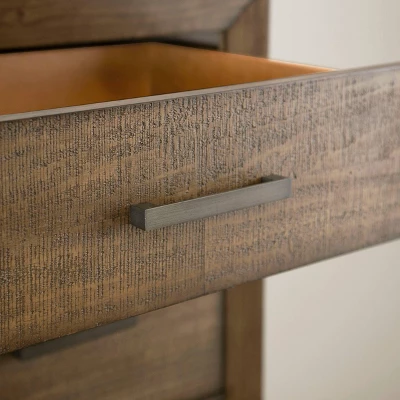 Redesign your dream nesting space with the Aurora Mid-Century four-piece bedroom set by Abbyson. Antique nickel hardware adds a touch of old-world charm to your bedroom while complementing the nice wood finish. Organize your linen and other bedroom essentials in the nightstands and chest which features, soft-closing drawers.