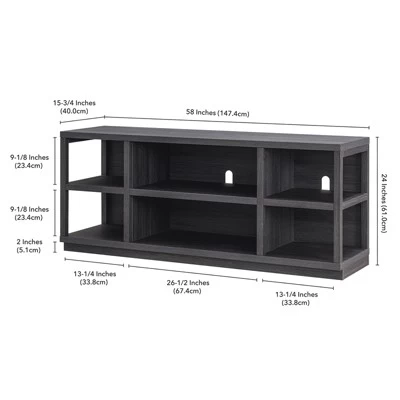 Striking in its simplicity, this Scandinavian-inspired TV stand emphasizes clean lines and straightforward design, from the planked-style wood to its streamlined silhouette. This two-shelf entertainment solution features six separate storage compartments, while the open-framed sides create an airy and open feel. Cable management cut-outs in the finished back panel keep your cable and cord situation in check.Features : Accommodates TVs up to 65″Finished in deep charcoal gray.The top has a weight capacity of 75 lbs. Lower shelves can hold 25 lbs. each.Features cable management cut-outsClean with a soft, dry cloth; no harsh chemicals or abrasive cleaning materials.Features easy assembly.Specifications : Product Weight : 64 lbs.Product Dimensions : 58″ W x 15.75″ D x 24″ H