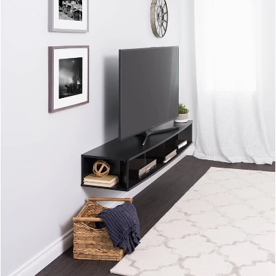 The Prepac 70 inch Wide Wall Mounted TV Stand saves space and has a modern look, making it the perfect fit for any entertainment space. The large 70 inch console provides more than enough space for all your media accessories. The three compartments are perfect for storing gaming consoles, cable boxes and accessories, while the two shelves on each side can be used to store games and DVDs. Each compartment includes cut-outs to keep wires neatly concealed and provides ventilation for media consoles. You can place your TV directly on top of the TV stand and eliminate the need for a separate wall-mount for the TV. The wall mounted TV stand can accommodate TVs up to 75 inches and mounts directly on the wall with Prepac’s innovative metal rail hanging system, leaving valuable floor space free for other essentials. The soft corners on the wall mounted TV stand add to the modern design, and leave any entertainment space looking clean and stylish. Constructed from non-toxic, CARB-2 compliant, laminated composite woods. Ships Ready to Assemble and includes an instruction booklet for easy assembly and has a 5-year manufacturer’s limited warranty on parts. Manufactured in Canada and meets all North American safety standards.