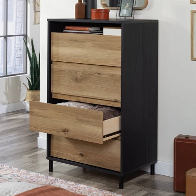 Lack of storage space is a thing of the past. Give your bedroom the additional storage it needs without having to sacrifice on the style you love with this 4-drawer dresser from the Acadia Way® collection. This rustic dresser features four spacious drawers that open and close on smooth metal runners and feature safety stops for easy access storage of items like stacks of slacks and your favorite blouses to comfy sweatpants and your collection of t-shirts. This 4-drawer chest has space for all of your things! A small open shelf provides additional storage for jewelry, your journal, or any other small items you need to keep close. The top surface of this wood chest of drawers is able to house your perfume, makeup mirror, or an accent lamp. This chest of drawers is accented with metal feet for durability and designed with a T-lock drawer system for quick and easy assembly. Finished in Raven Oak® with Timber Oak™ accents, a black dresser with rustic accents is just what you’ve been looking for!