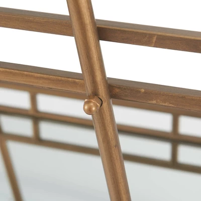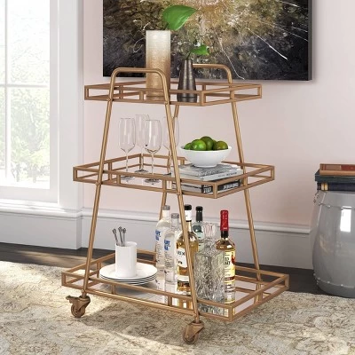 Add vintage flair to your home bar with this elegant rolling cart. A charming blend of style and function, this multi-purpose serving cart is great for everyday kitchen use or while entertaining. Rolling wheels and two bronzed handles make it easy to move the party from the kitchen to the living room, and casters lock in place for extra stability. Warm bronzed metal and three sparkling mirrored shelves are a fun and stylish addition to your home. Enjoy the timeless charm of the sophisticated frame, constructed with sturdy metal to support three glass shelves. Perfectly sized to display your favorite decor and accessories.