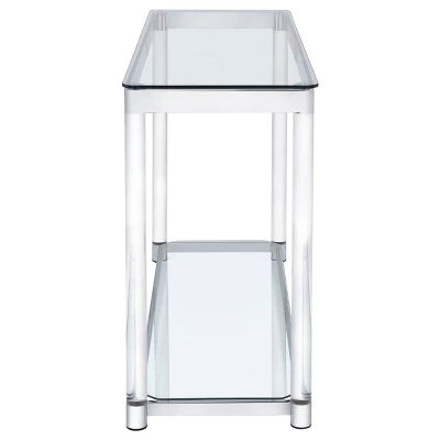 Create an elongated look with the bold metallic details from this clear sofa table. Complete with rounded acrylic legs, the sleek silhouette is full of glamour. Display sculptures or photos on the glass top or sleek built-in shelf. Celebrate a minimalist-inspired silhouette with the clear lines in the chic frame. Perfect for any modern or classic motif, this table is versatile and elegant.
