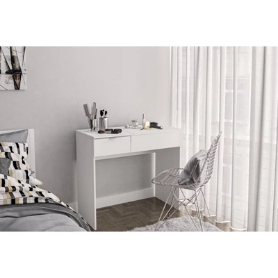 The Pull Top Vanity is a perfect addition to any room. This vanity has plenty of storage for all your make-up and any other products you have in your room. The table top opens to an enclosed storage space and mirror. This vanity also includes a drawer on metal glides. The versatile design allows this piece to be used as both vanity and writing desk when the top is closed. With the modern design and amble work space, this vanity will go great in any room.