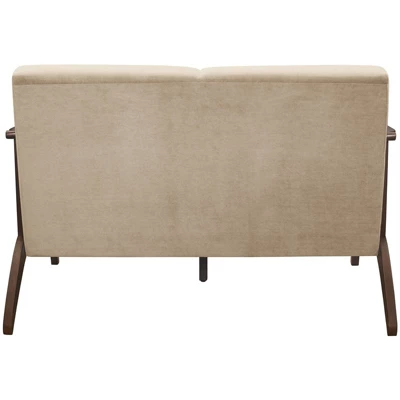 The frame of the Carlson Collection recalls a time when simplicity of profile was the height of style. The streamlined design of the love seat’s subtly sloped wood arms and legs is finished in dark walnut which serves to highlight the light brown velvet covering.Features : Finish: Dark Walnut and Light BrownMaterials: Solid Rubberwood, FoamUpholstery: 100% PolyesterFabric Type: VelvetCushion Type: Coil Insert/ InnerspringFabric Care: Upholstery (S)Style: Mid-Century ModernSolid rubberwood frameFoam padding over pocket coilsVelvet fabric upholsteryAttached back and seat cushionsExposed wood frame with dark walnut finishAssembly requiredSpecifications : Product Dimensions : 32″ H x 51″ W x 31.5″ DProduct Weight : 51.5 lbsSeat Dimensions : 19″ H x 44″ W x 21″ DArm Height : 23.5″Weight Capacity : (Per Seat) 300 lbs