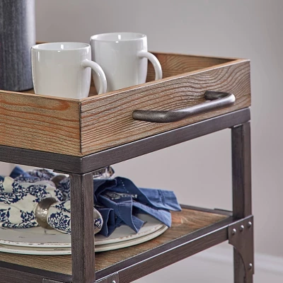 - Wood and metal bar cart has a distressed finish for a stylish, antique-inspired look