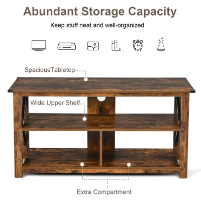 Watch your favorite movie or TV show in a neat as well as beautiful surroundings. This rustic TV stand with cable management hole will help you. Its wide tabletop is capable of accommodating TVs up to 55”. Still be firm enough to withstand high load bearing capacity. Thanks to the predrilled cable management hole, there is no worry about visible messy wires any more. Besides, open storage shelf can not only provide ample storage space but also make it possible to showcase your beautiful ornament. Thickened wood panel is not easy to deform, which features lasting durability to serve you better. Its rustic design shall add unique flair to your house, whether being placed in living room or bedroom. Bring this unique open style media stand home, and enjoy your good time watching TV.