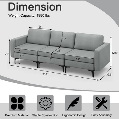 - Shipped in 3 Boxes: This 3-seat sofa couch comes with 3 boxes, so that you may not receive all the packages at the same time. The detailed instruction can guide you step by step through the installation. Overall dimension of the sofa: 94.5” x 32.5” x 32.5” (L x W x H); weight capacity of each seat: 660 lbs.