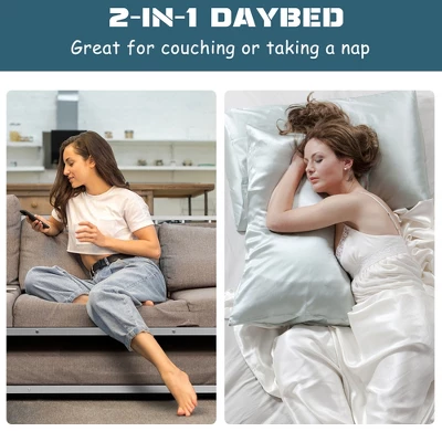 - Metal Daybed with Trundle: This 2-in-1 daybed consists of a sofa bed and a pull-out trundle bed, makingit a space-saving choice for temporary sleeping, such as overnight parties. The trundle bed canbe hidden underneath when not in use. And with 4 universal casters and 2 brakes, you can easily pull it out and set it in place as needed.