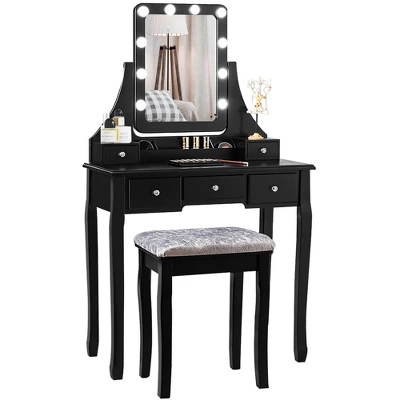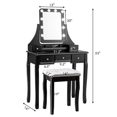 This dressing table has a simple and classic design with 5 large drawers, a detachable slot and a spacious table top to be easy to organize jewelry, cosmetics, perfume, etc. The countertop is made of high-quality MDF material, with its a smooth surface easy to clean. In addition, the mirror is combined with 10 LED lights to light up your beauty. With 360 swivel design, the mirror can be positioned to your desired angle. The stool will provide you with superior comfort and reliable support