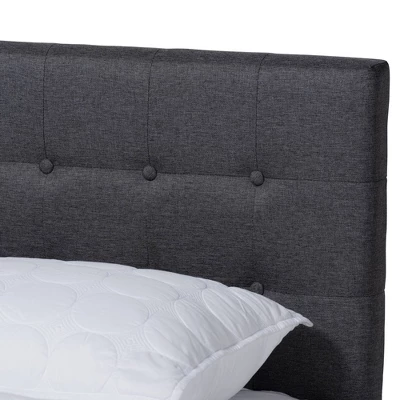 Natural wood tones are paired with gray hues to give the Devan bed a cool, contemporary look that transforms any bedroom. Built with a sturdy wood frame, the Devan features a low platform finished in a warm walnut brown. Its splayed legs create a cool profile from any angle. The headboard is upholstered in a soft, foam-filled fabric that provides ample comfort for you to lean against. Button tufting adds dimension and elegance. The Devan bed is made in Malaysia and requires assembly. Dimensions: 48.03″ high x 56.69″ wide x 77.36″ deep; Headboard: 56.69″ wide x 19.49″ long x 2.56″ thick; Distance between slats: 2.95″; Height from floor to top of slat: 13.39″ high; Legs: 24.02″ high; Inside dimensions (mattress size): 54″ wide x 74″ deep