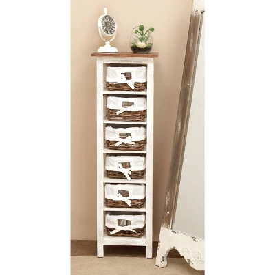 - •Wood shelving unit features shelves that supports 6 brown wicker baskets with tied linen lining and cutout slots for easy carry and storage
