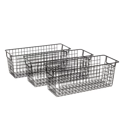 Keep a wide array of small items neat and organized with this 3-piece metal wire basket set. Our rectangular wire baskets are perfect for sorting magazines and other small items. Each of the black wire baskets features convenient handles and ample room to store envelopes, juice boxes, or school supplies. Each wire storage basket is made from durable iron with a rust-resistant finish that will complement any home or office decor. You will receive 3 wire storage baskets, each measuring 16 x 6 x 6 inches, perfect for any home, kitchen, or office.