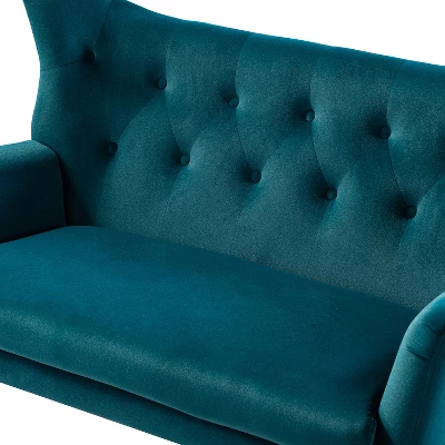 Providing a fresh and pleasing look to your space and adding little characteristics. This high-quality foam-filled accent loveseat with a sturdy solid and manufactured wooden frame provides superb comfort and support. Shown in a beautiful velvet upholstered fabric, its sleek lines, comfortable for skin touch, and features an on-trend solid hue thats bound to blend in with your color scheme. With button-tufted details decorating the chic wingback for a dash of distinction and four slender legs rounding out a fatal attraction, this small loveseat for you and your loved one brings soft and warm enjoyment at home. Whether you are looking for an intimate conversation with someone or a place to stretch out in style, you will be well covered. It will have no problems blending into your home decoration with natural, modern style and incredible durability, the perfect pick for bedroom, living room, and other scenes.Item Size:50.7″Wx29.3″Dx37″H.
