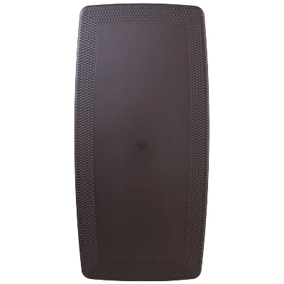 This attractively designed folding table will add some pizzazz to your residential or commercial space. The table top features a decorative rattan border. The center umbrella hole has a cap to cover the hole for a clean surface appearance when an umbrella isn’t inserted. The dark surface blends with a variety of decor. Stow it out of the way when not in use, and easily set it up when needed for a holiday dinner, buffet, garage sale, or any other activity. You’ll turn to this table for help over and over again. Additional Features: Gray Powder Coated Locking Legs, Decorative Rattan Edge Border, Waterproof, Impact and Stain Resistant Top, Protective Floor Caps, Designed for Commercial Use