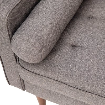 Take your design to the next level and add cozy comfort to any room with the trendy mid-century modern aesthetic of this compact sofa, ideal for small spaces. Upholstered in faux linen fabric and boasting buttonless tufting on the seat cushion, this sofa lends a chic, updated look to any space. Durability is just as important as great looks and this modern sofa has plenty of both. Real wood legs and a solid wood frame allow this sofa to hold up to 800 Lbs. static weight while generous foam padding paired with pocket springs adds an extra supportive feel. Fixed floor glides prevent damage to your hard flooring surfaces and the attached seat cushion keeps your space tidy but the back cushions can be removed for a quick catnap. Assemble your new couch in less than 10 minutes with no tools required and easily keep it looking new by cleaning with a damp cloth. This on-trend seating arrives in a single box and pairs with other pieces in our collection giving your room a sophisticated, cohesive look.