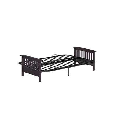 - Mission style wood arms with a sturdy metal frame with extra center legs for added support. Includes retainer clips to help prevent mattress from sliding.