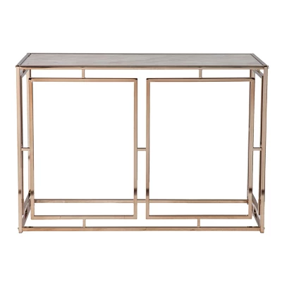 Put a modern twist on your classic décor with the Aiden Lane Glenshippe Faux Marble Console Table. Printed glass creates a sleek, glossy look, while the spacious tabletop holds everything from your favorite books to a set of table lamps. Inspired by both traditional and contemporary designs, this narrow sofa table complements a variety décor styles and color schemes. Add a hint of elegance to your entryway or living area when you bring home this faux marble console table.