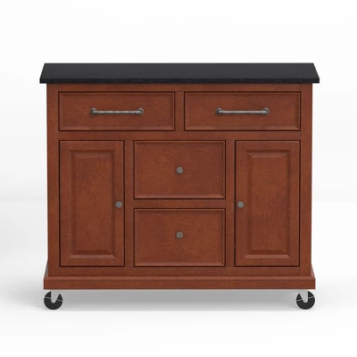 - This classic island brings refined style and smart storage to your kitchen. It’s made of engineered wood with 4 top options (Wood, Stainless Steel, Grey Granite, and Black Granite) all of which are great for meal prep and serving. Paneled door and drawer fronts offer a traditional look. At 42″ in width, this kitchen island is perfect for small to mid-sized kitchens, while maximizing storage capacity with two upper drawers for utensils and linens. It also has two additional lower center drawers with two side cabinets, each revealing two adjustable shelves for your serveware and small appliances. Plus, this island’s removable locking caster wheels allow you to move it wherever you need it, and help you keep it firmly in place.