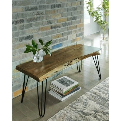 With its back-to-nature sensibility, this accent bench is a natural fit for your well-edited space. Its clean-lined design lets the beautifully organic quality and inherent luster of the solid wood shine through. From its live edge top to the rich brown finish, it’s a piece that makes a statement by being remarkably understated. The black metal hairpin legs add a striking contemporary counterpoint. The trusted source for stylish furniture, lighting, rugs, accessories and mattresses for every taste and budget, our wide assortment brings your space to life with furniture and decor that show off your style personality. We can help you to create a space that reflects your good taste through your room decor. And we also go the extra mile to package, protect and deliver your purchase in a timely manner. Signature Design by Ashley is a registered trademark of Ashley Furniture Industries, Inc..