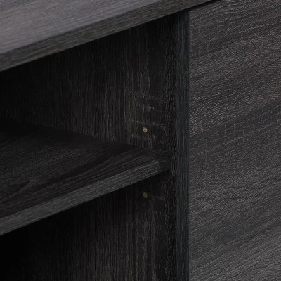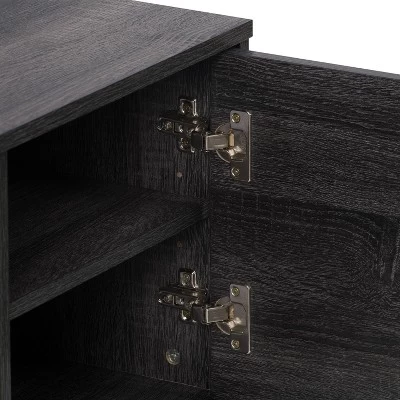 Take your living room to the next level with this stylish modern TV stand. Comprised of two cupboards, and open shelves for a sleek yet classic appearance. This entertainment center creates additional storage space in your home for media, electronics, accessories, books, or decor. The beautiful rich wood grain finish with silver pillar legs looks great in any aesthetic. This bench fits most TVs up to 55″ and is the perfect combo of classic colors and finishes.