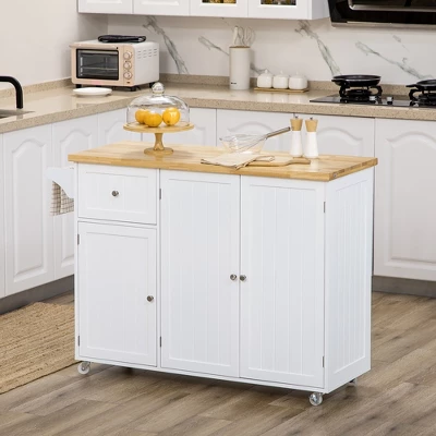 This kitchen cart with storage from HOMCOM fits limited spaces and can be moved wherever you need it. A pull-out drawer, three storage cabinets, and a towel rack provide ample room for supplies and accessories. Easy-roll wheels allow you to move it wherever it is needed most. Make your house a home with HOMCOM.