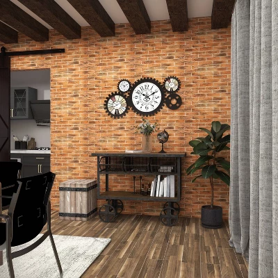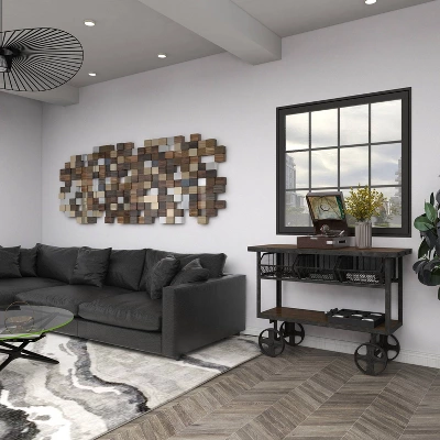 - •It accentuates a rectangular figure cart inspired console table with wheel legs