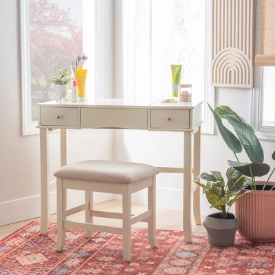 The Cream Jackson Vanity Set is perfect for providing storage and grooming space in a large bathroom or bedroom. The spacious top features a flip top that has a hidden mirror and open storage area. Two storage drawers are accented with small round pulls and provide ample hidden storage space. The cream finish and sleek design are ideal for any decor style.