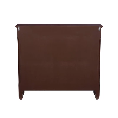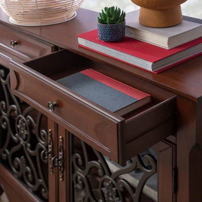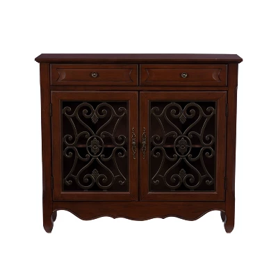 The Julio Light Cherry 2-Door, 2-Drawer Scroll Console is expertly crafted with delicate reinforced cast resin faux metal grillwork in a hand applied pewter finish that add an extra dimension to this timely piece. Featuring a spacious two door and two drawer storage area with interior, fixed shelf this piece is designed to keep a busy household organized. Its compact design makes this the perfect piece to add to an entry or living space. Finished in a rich “Light Cherry”, the bottom of the unit is accented with delicate curves. Fully assembled.
