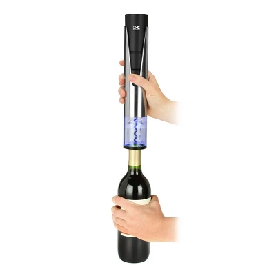 Open your wine in style and keep it tasting fresh with this sleek and sophisticated must-have for the modern wine enthusiast. The Kalorik 2-in-1 Wine Opener and Preserver seamlessly opens and reseals bottles of wine to keep them fresh for longer. Its special 2-in-1 design features an opener on one end, and a preserver on the other. The preserver vacuum seals opened bottles to prevent oxidation and keep your wine delicious for days. The device features brushed stainless steel housing and a transparent shell surrounding the corkscrew mechanism which lights up blue when in use. The Kalorik 2-in-1 Wine Opener and Preserver comes with two wine stoppers and a foil cutter. Accessories are conveniently stored in the appliance’s charging base. Its smart, cordless design offers convenience of portability.