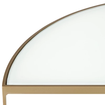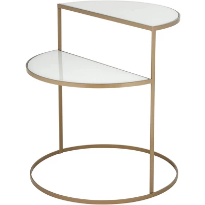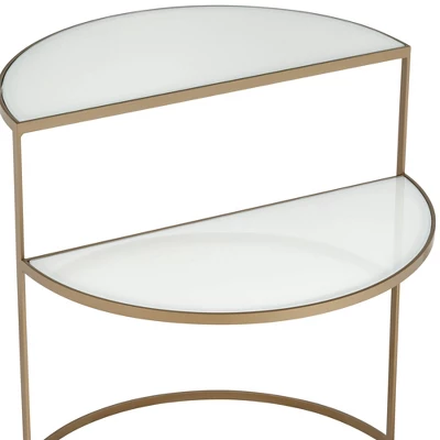 Show off your personal belongings on the staggered two-tier layout of the Danica gold metal and white glass side table. This luxe design from the Kensington Hill brand features two metal tiers with a gold finish. White tempered glass in a half-moon shape offers the perfect place to rest your possessions.