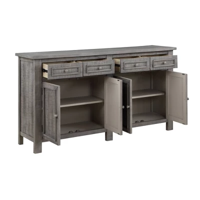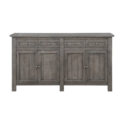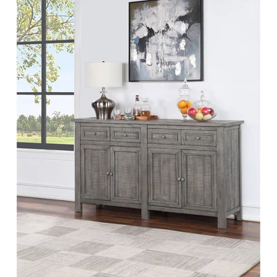 Crafted of solid Acacia wood, this tasteful credenza has a relaxed Keystone Grey finish and chatter markings throughout for the perfect worldly feel. With four doors that open to reveal fixed shelves, this piece provides ample storage for magazines, books, and board games. Enhance the style and functionality of your living room or den with this perfect credenza.