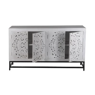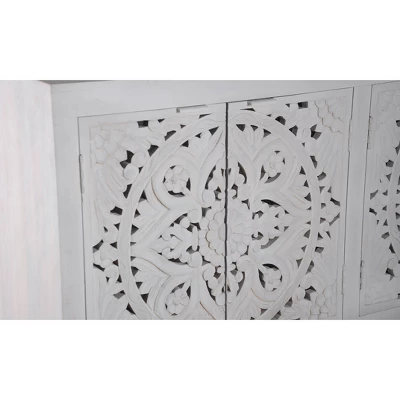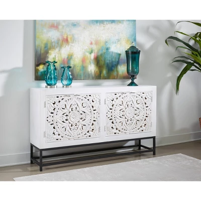 Stunning hand carved panels form the four doors of this majestic Credenza, and are perfectly framed by the smooth linear shape of the body. Coated in a soothing Floral White Wash, this Credenza is perched atop a dark open tubular framework for a subtle contrast. With a spacious surface for display, and a roomy shelved interior complete with a built in cord management system, this Credenza will be a welcome addition as well as a sensational focal point for any decor.