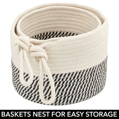 This Two-Toned Bathroom Storage Basket Set by mDesign makes it easy to store bathroom necessities and toiletries in one convenient place. These charming bins fit in almost any small nook in your bathroom as well as inside cabinet or closets, bedside the counter or most standard sized toilet tanks for compact bathroom storage. They serve as a beautiful accent for bathrooms and powder rooms while keeping items neat and organized. The two-toned woven cotton rope design blends nicely with any bathroom decor and features a built-in knotted loop handle for portability or to mount to the wall for added texture and style. Moving and rearranging these baskets is simple and easy! Use these baskets together as a set or spread them through other rooms in your home to hold all your favorite items and reduce clutter. mDesign – Solutions for Home. Solutions for Life.