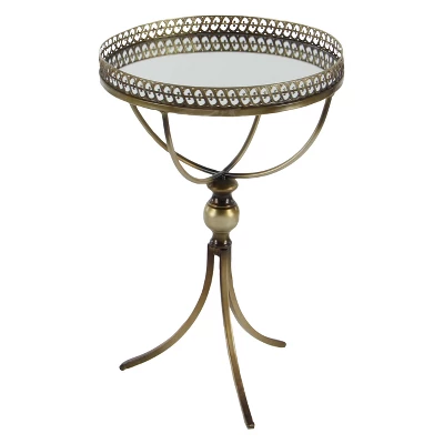 - •Gold metal side table features a raised perforated metal frame for a secure display on a reflective mirror inlay tabletop