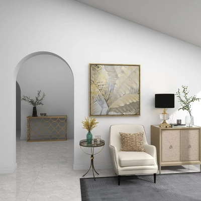 - •Metal and glass accent table flaunts a distressed brass finish that brings a traditional look to your home