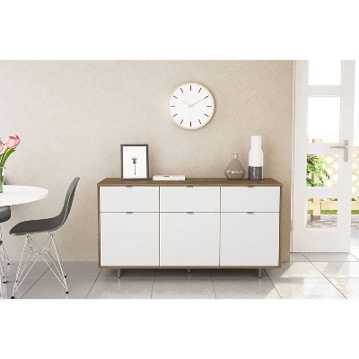 The Montana Sideboard is the perfect fit for any home with it’s modern and functional design. This sideboard has a white and walnut melamine finish with metal legs. The 3 drawers and 3 cabinets offer plenty of storage options to keep all your items organized. This sideboard is available in two sizes – 58 inch width and 53 inch width.