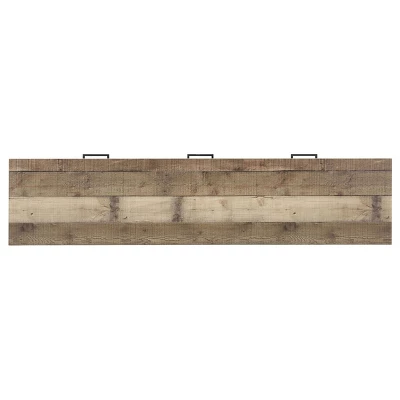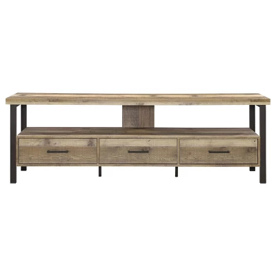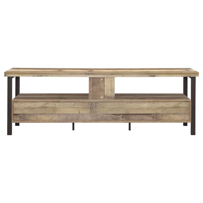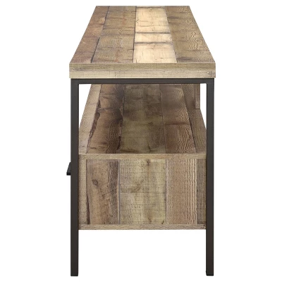 - Rustic TV stand in a charming weathered pine finish with a sturdy metal frame in a stylish dark bronze finish