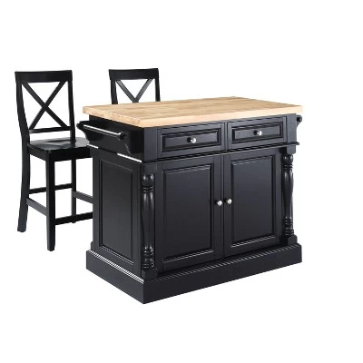 Enduring style and classic function are the hallmarks of the Oxford 3pc Kitchen Island Set. Designed for longevity, the island offers traditional elements like raised panels and decorative carved spindles. A perfect centerpiece for your kitchen, you can easily access kitchenware and utensils from either side of the island using the pass-through drawers and cabinets. With a built-up countertop and towel bars at either end, the island is ideal for food prep. Two X-back stools round out the set, creating a perfect perch for a quick meal. Add beauty and quality to your kitchen with the Oxford 3pc Kitchen Island Set.
