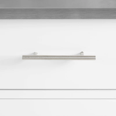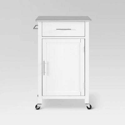 Organize your kitchen with the space-saving design of the Savannah Compact Kitchen Island/Cart. Ideal for adding extra storage and workspace, this island offers a sturdy stainless steel countertop and large cabinet with an adjustable shelf inside. The caster wheels on that base allow you to create a flexible food prep or serving space, while the full-extension drawer adds an ideal spot to tuck away everyday items. By adding a towel bar on one side and two utility hooks on the other, the Savannah Compact Kitchen Island addresses all your at-home chef needs.