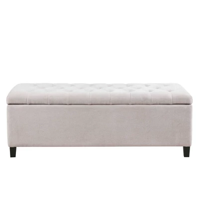 The Selah Tufted Top Storage Bench offers a sophisticated storage option that elevates your home decor. This accent bench come fully upholstered and features a button tufted top that adds a refined touch to the luxurious design. The solid wood legs showcase a dark wood finish that beautifully complements the upholstery, for an elegant transitional look. With ample storage space for blankets or other home essentials, this upholstered storage bench adds functionality and style to your bedroom or living room. Leg assembly is required and tools are included.