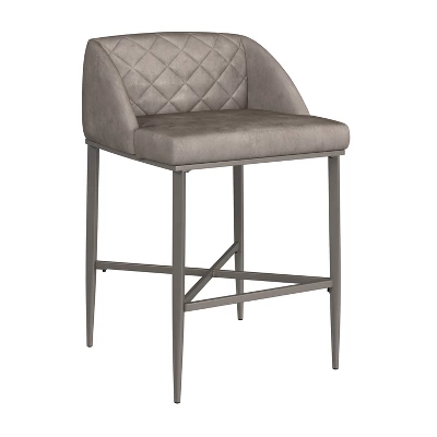 With Midcentury modern design, the Hillsdale Furniture Phoenix Non-Swivel Counter Height Stool is a masterful example of the style. Its geometric diamond stitch upholstered details and X-design stretcher blend handsomely with the subtle curvature of the low seat back and arms. Upholstered in a weathered gray faux leather with ample padding. The Pewter metal features a powder coat that’s more matte than glossy. Sold as a set of 2. Ideal at your counter height dining table or kitchen island. Assembly required.