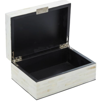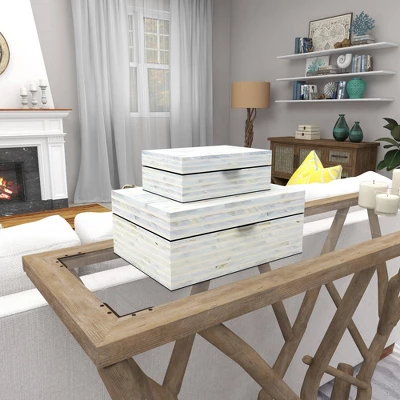 Perfect way to add depth and texture to your surface space with this compact and discreet box. A practical yet stylish upgrade that instantly elevate the look of your room. This coastal style wood storage box with lid will make a great jewelry box or a table centerpiece in your laidback home. Designed with felt or rubber stoppers at the base that prevent scratching furniture and table tops, as well as sliding around. This item ships in 1 carton. Mother of pearl box makes a great gift for any occasion. Due to the handmade nature of this item, no two will be alike, there will be slight differences in shape, size, and color. Suitable for indoor use only. This item ships fully assembled in one piece. Made in Vietnam. This white colored decorative keepsake box comes as a set of 2. Coastal style.