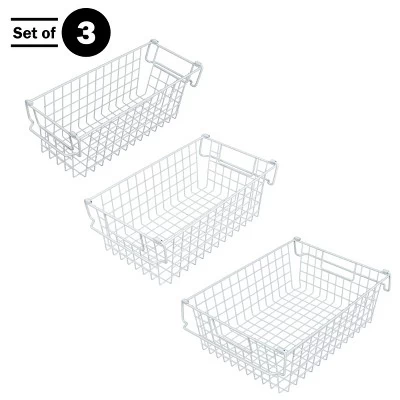 - PRODUCT DETAILS – Materials: Metal. Dimensions: Small: (L) 16” x (W) 6” x (H) 5.5”; Medium: (L) 16” x (W) 9” x (H) 5.5”; Large: (L) 16” x (W) 12” x (H) 5.5”. Set of 3 Includes 1 Small, 1 Medium, and 1 Large Basket. Color: White.
